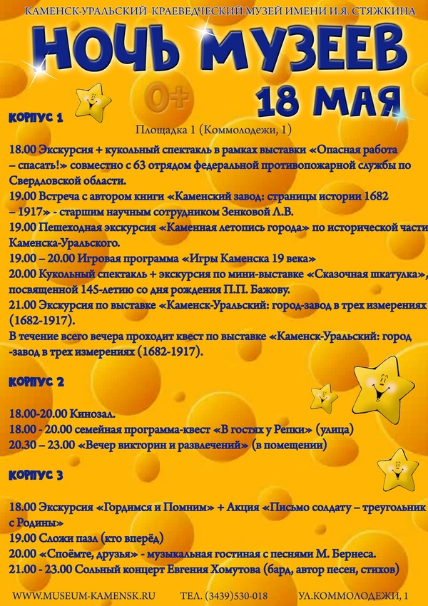 Акция приурочена к Году семьи, 90-летию Свердловской области, 225-летию со дня рождения А.С. Пушкина, 145-летию со дня рождения П.П. Бажова. В Каменске-Уральском Ночь музеев пройдет 18 мая с 18:00 до 23:00. Основные мероприятия состоятся в Краеведческом музее им. И.Я. Стяжкина.